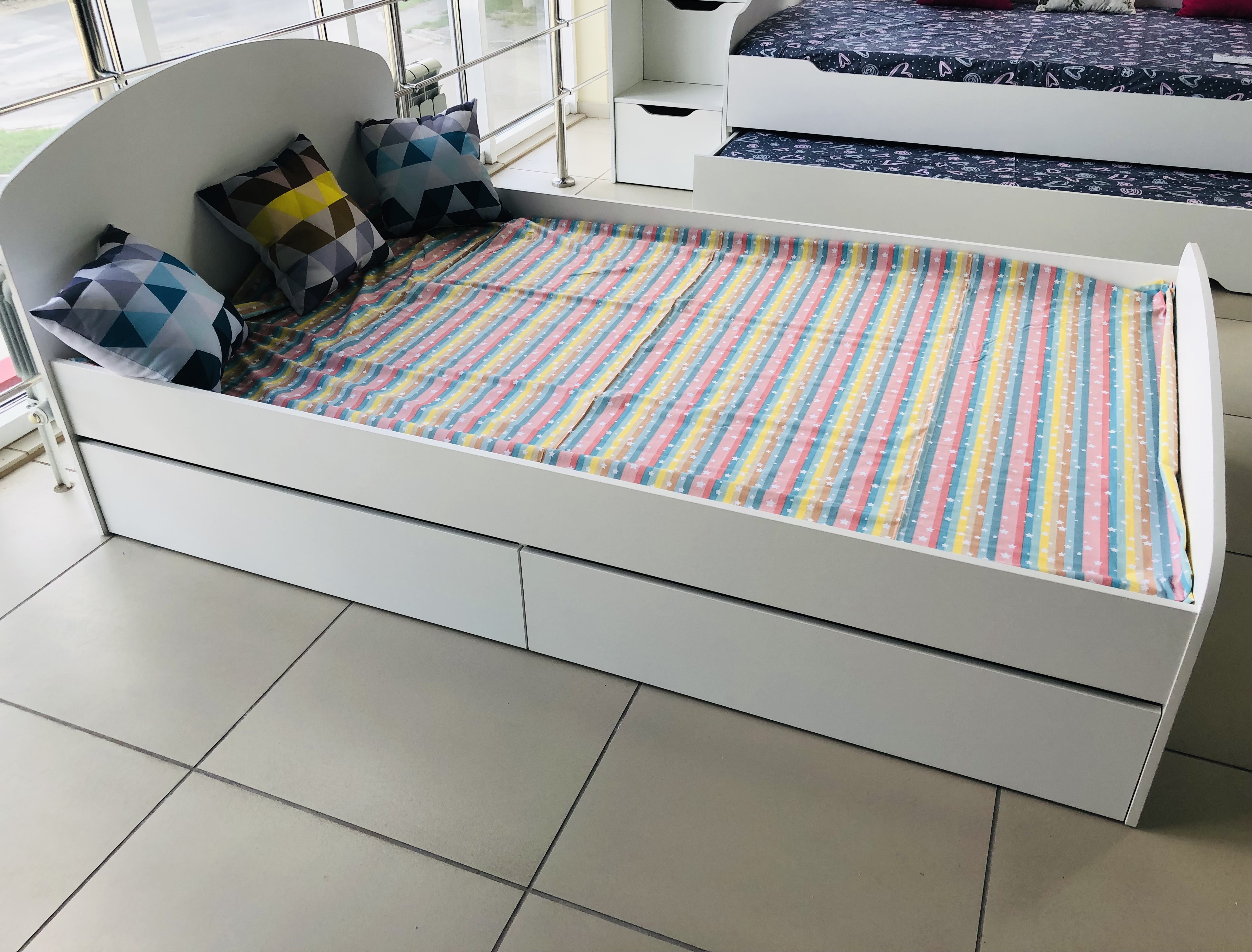 Вместо них - цельный и прочный настил из ЛДСП, который выдерживает сверхвысокую нагрузку и позволяет расположиться даже взрослому с ребенком.