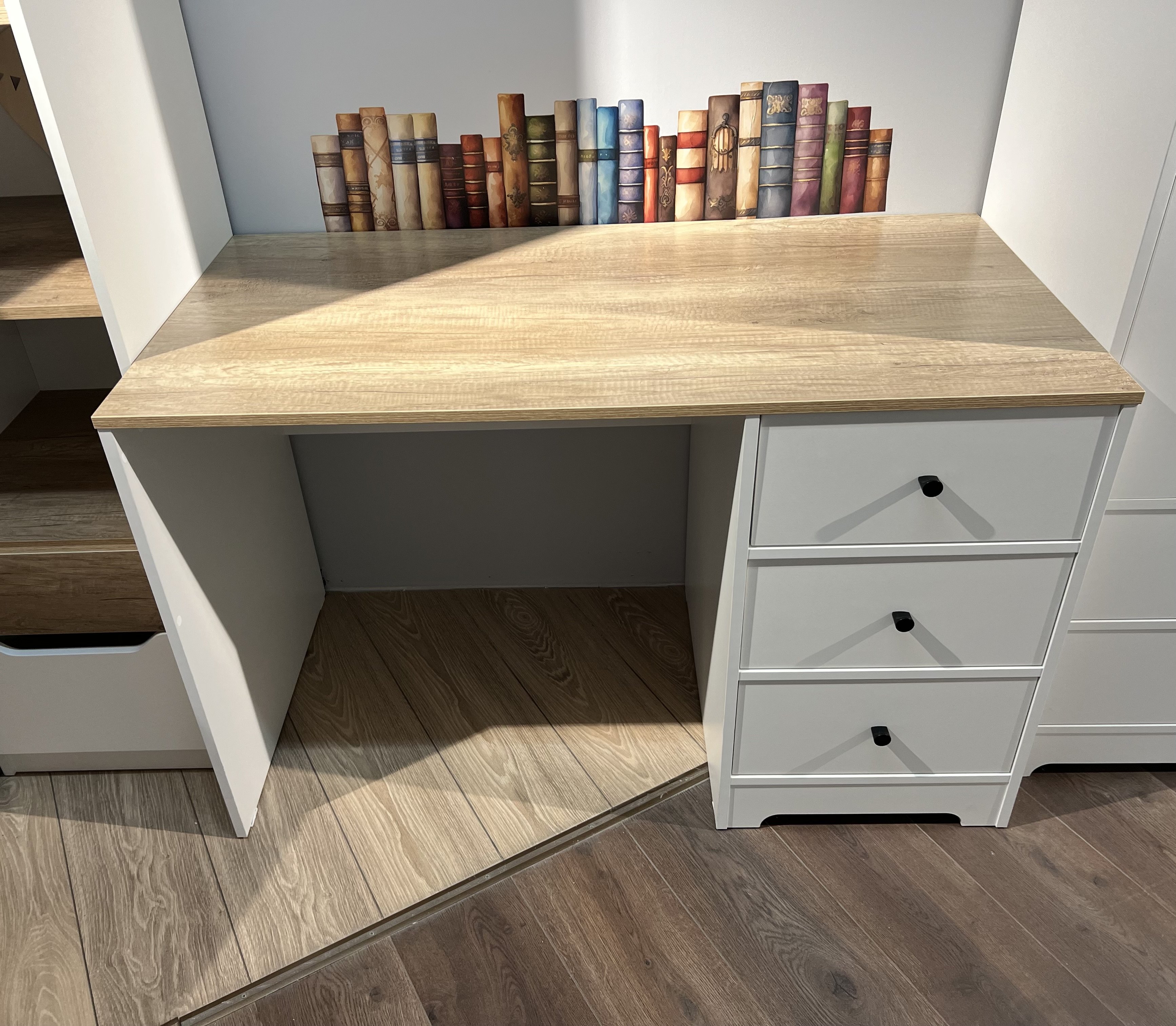 В стол встроены три выдвижных ящика на направляющих скрытого монтажа с ДОВОДЧИКАМИ.
