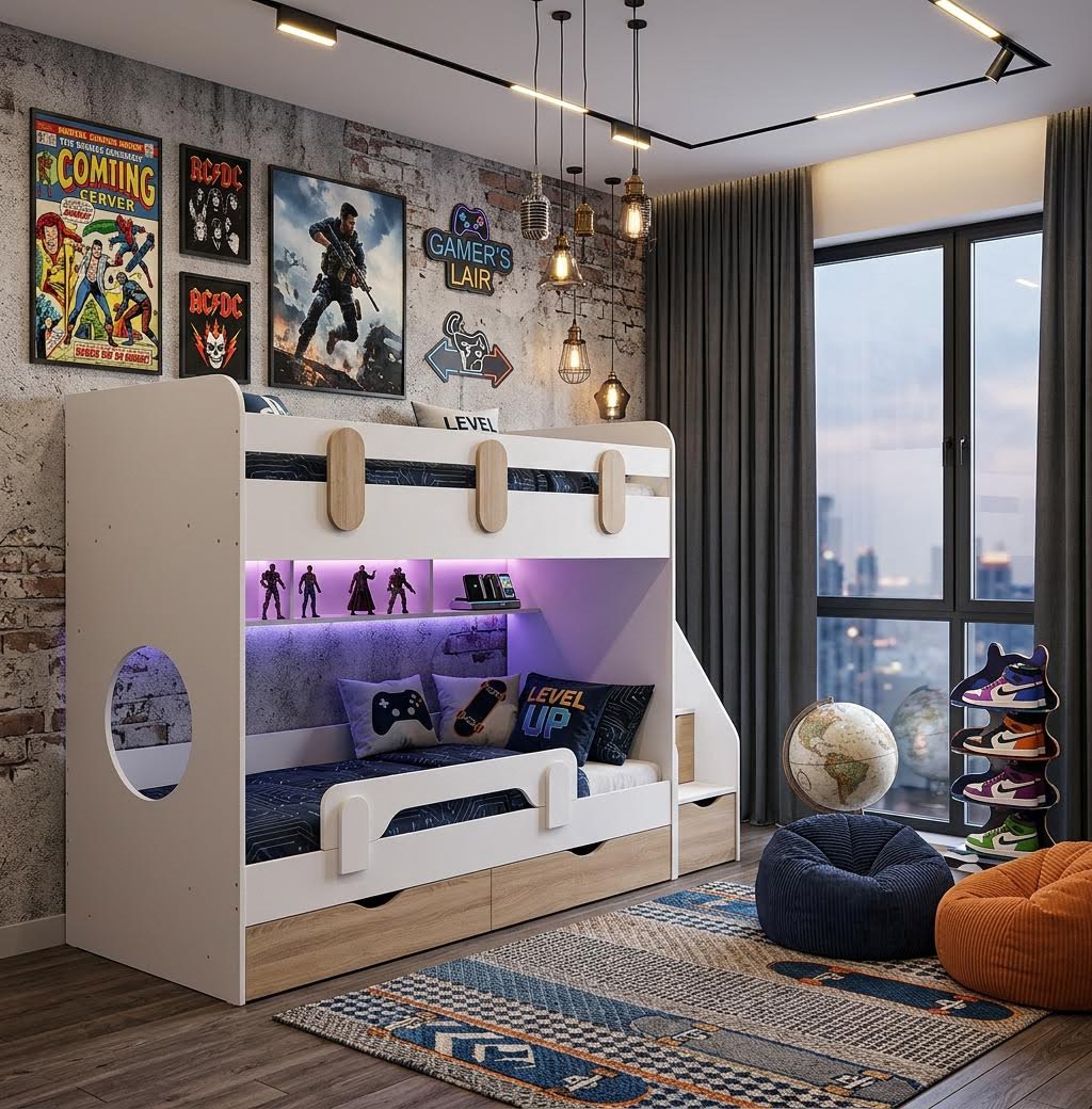 Выдвижные ящики в нижней кровати изготовлены с применением метабоксов, что делает изделие практичным и надежным.