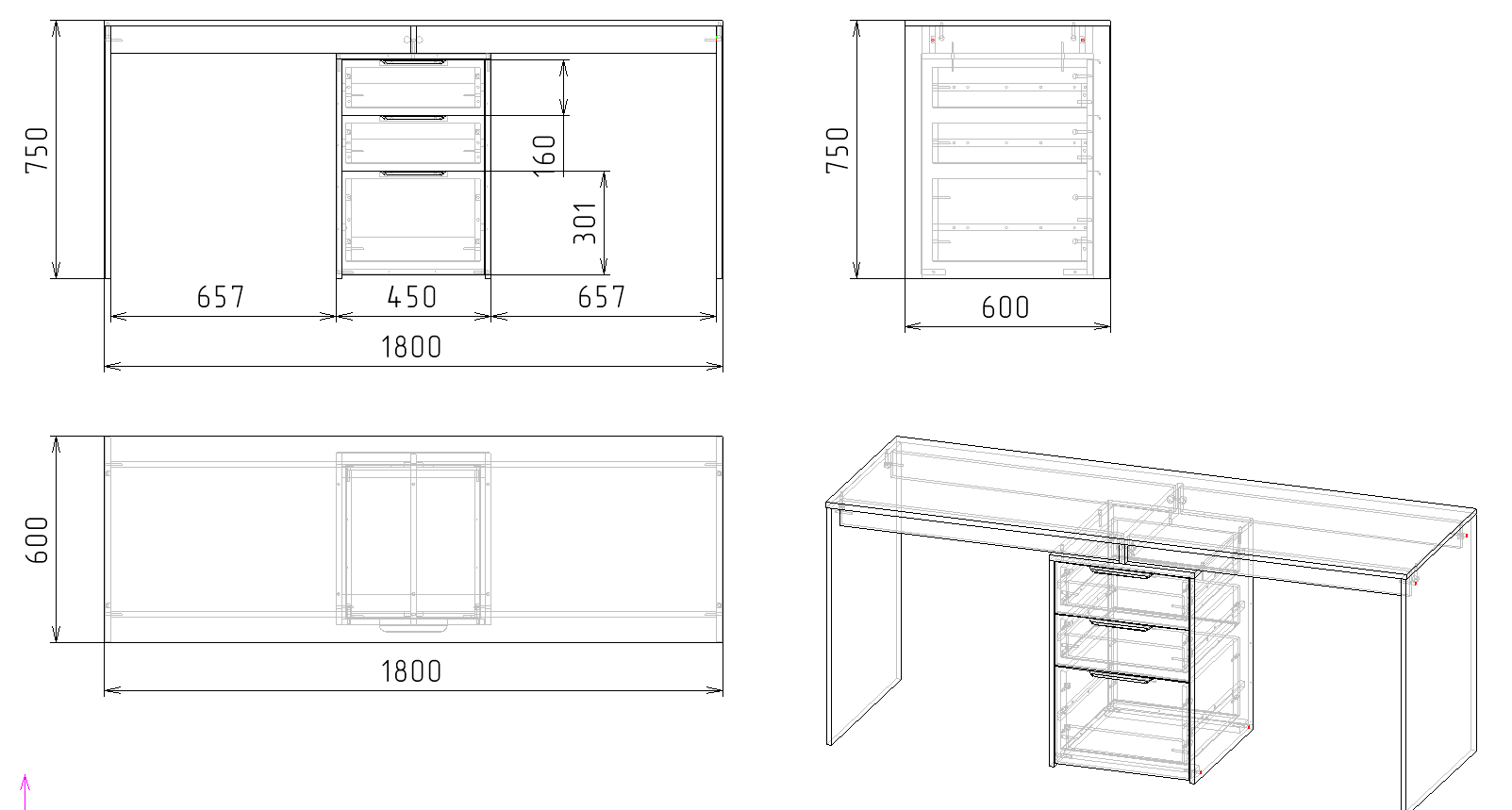 Габариты стола: ширина 1800 х высота 750 х глубина 600 мм