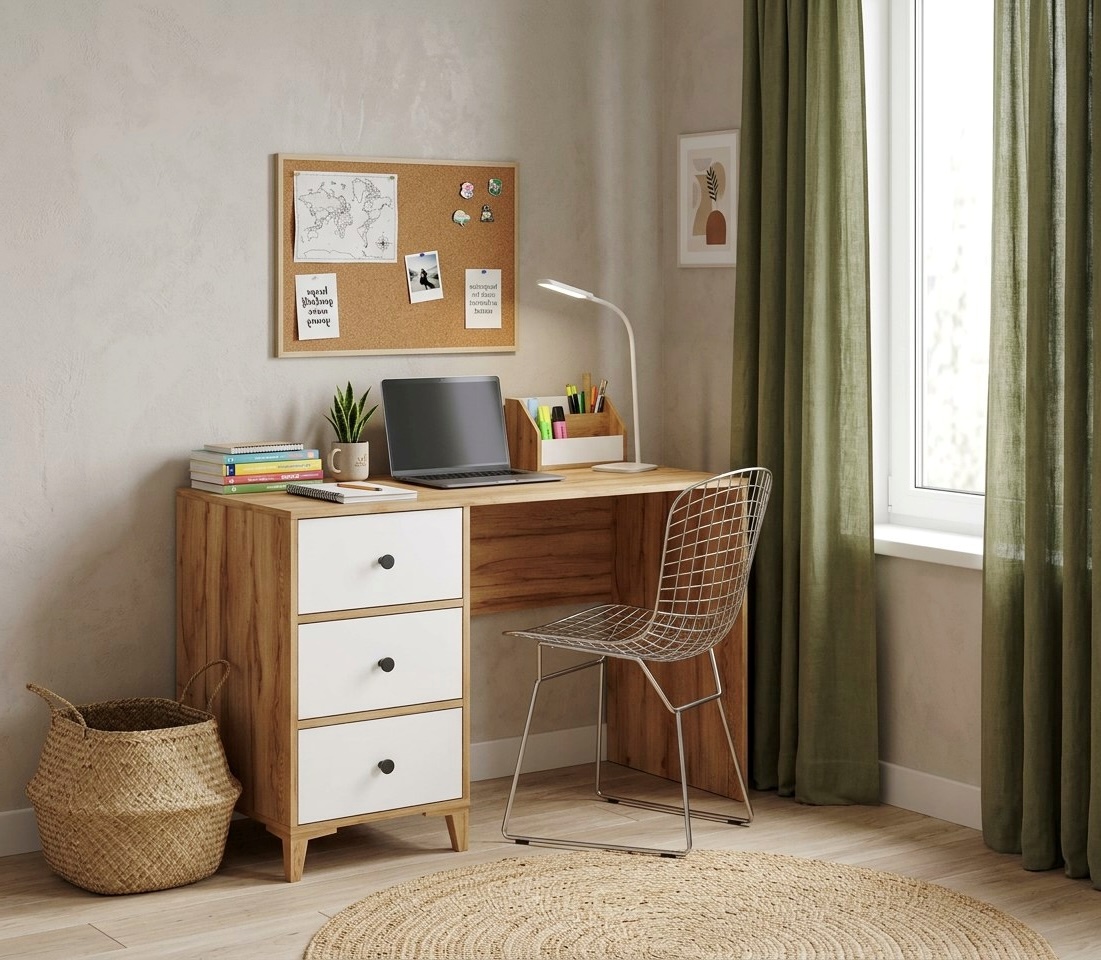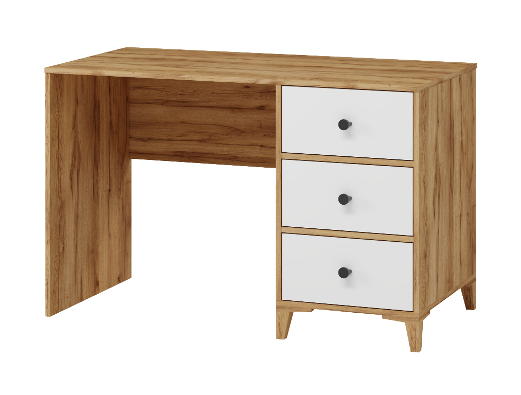 В стол встроены три выдвижных ящика на направляющих скрытого монтажа с доводчиками.