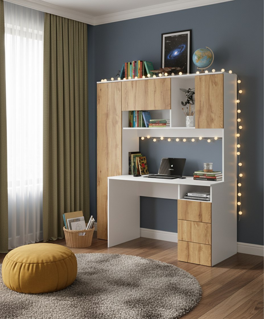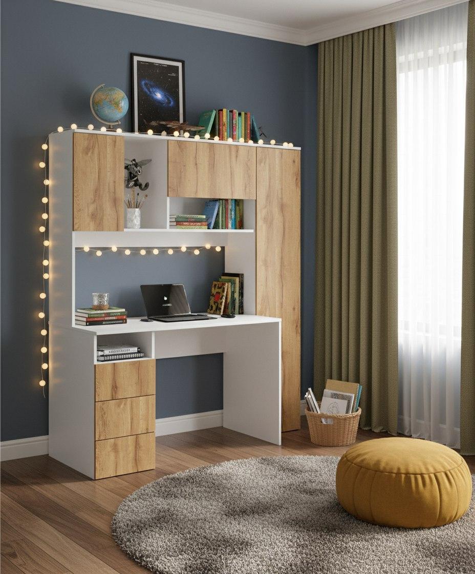 Просторная поверхность, удобные полки и ящики позволят разместить учебники, книги и канцелярию.