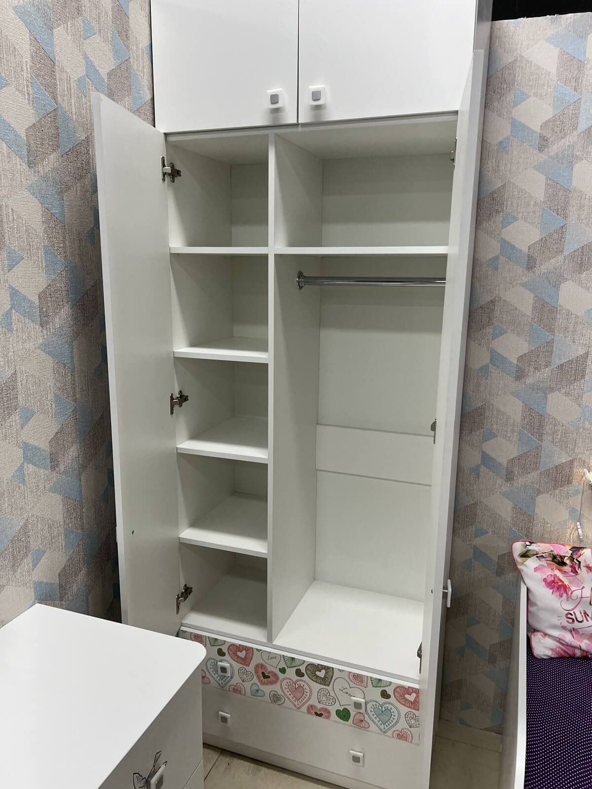 Внутри шкафа имеются штанга для вещей и дополнительные полки.