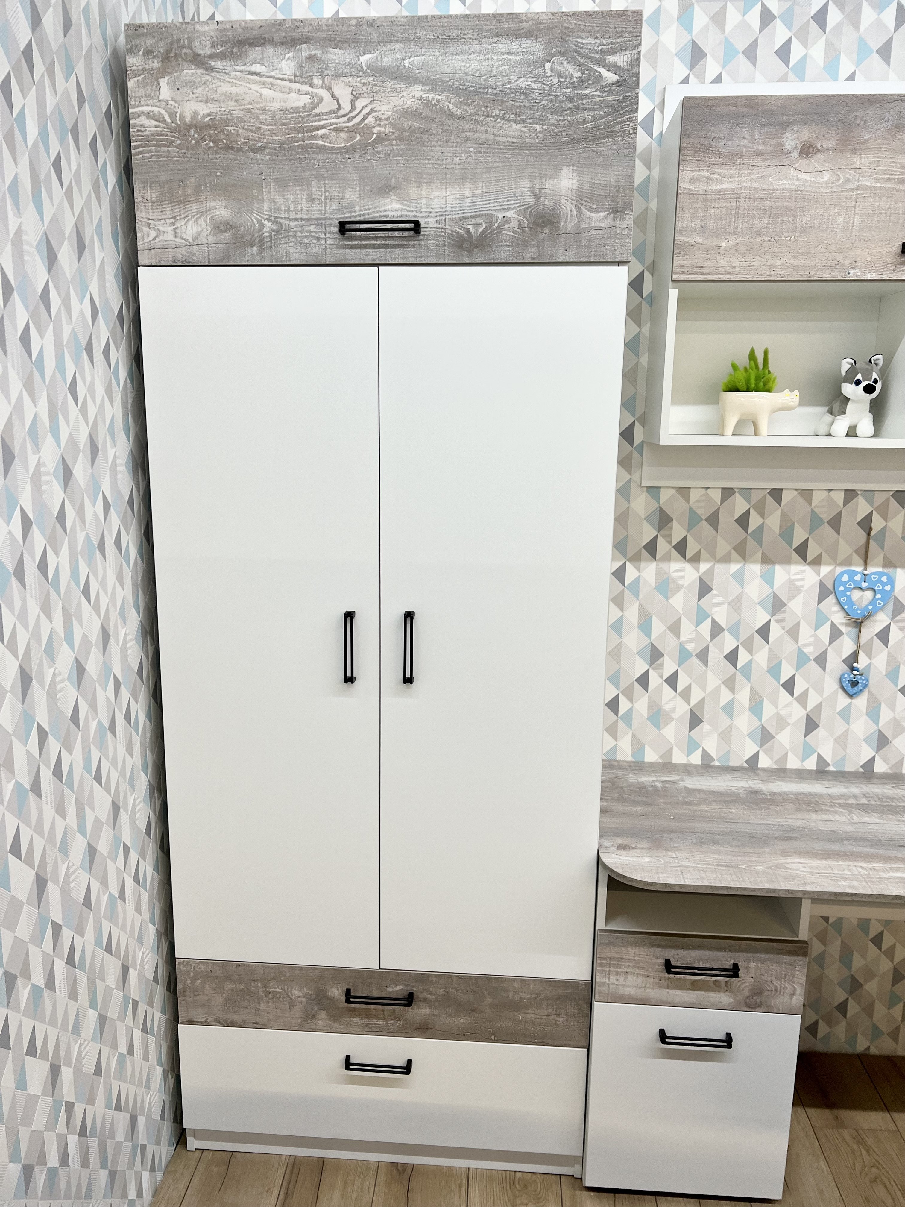 Мебель выполнена из сертифицированного, качественного, экологически чистого ЛДСП класса Е0,5  в сочетании цветов "бетон пайн" + белый.