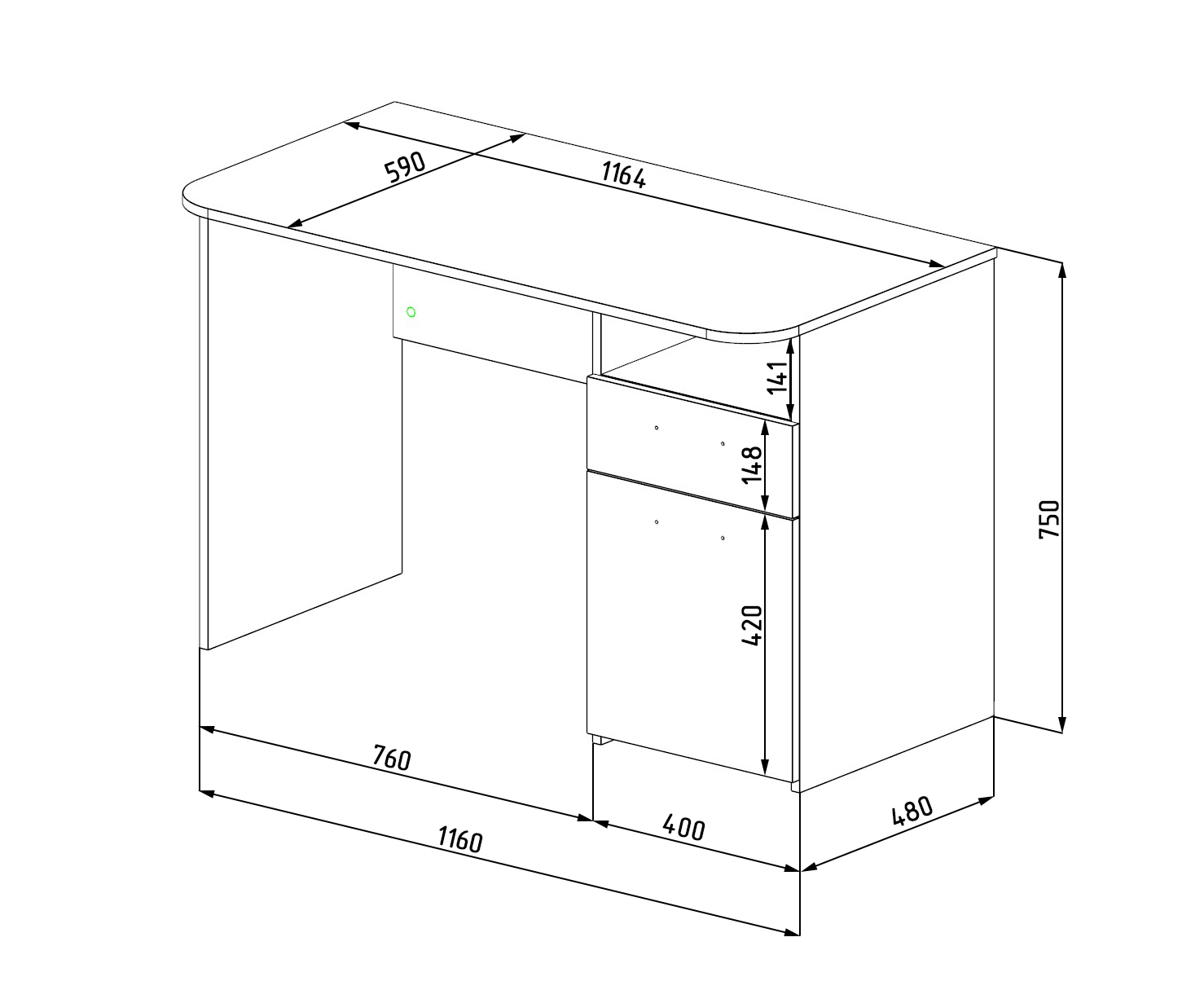 Габариты стола: ширина 1164 х высота 750 х глубина 590 мм
