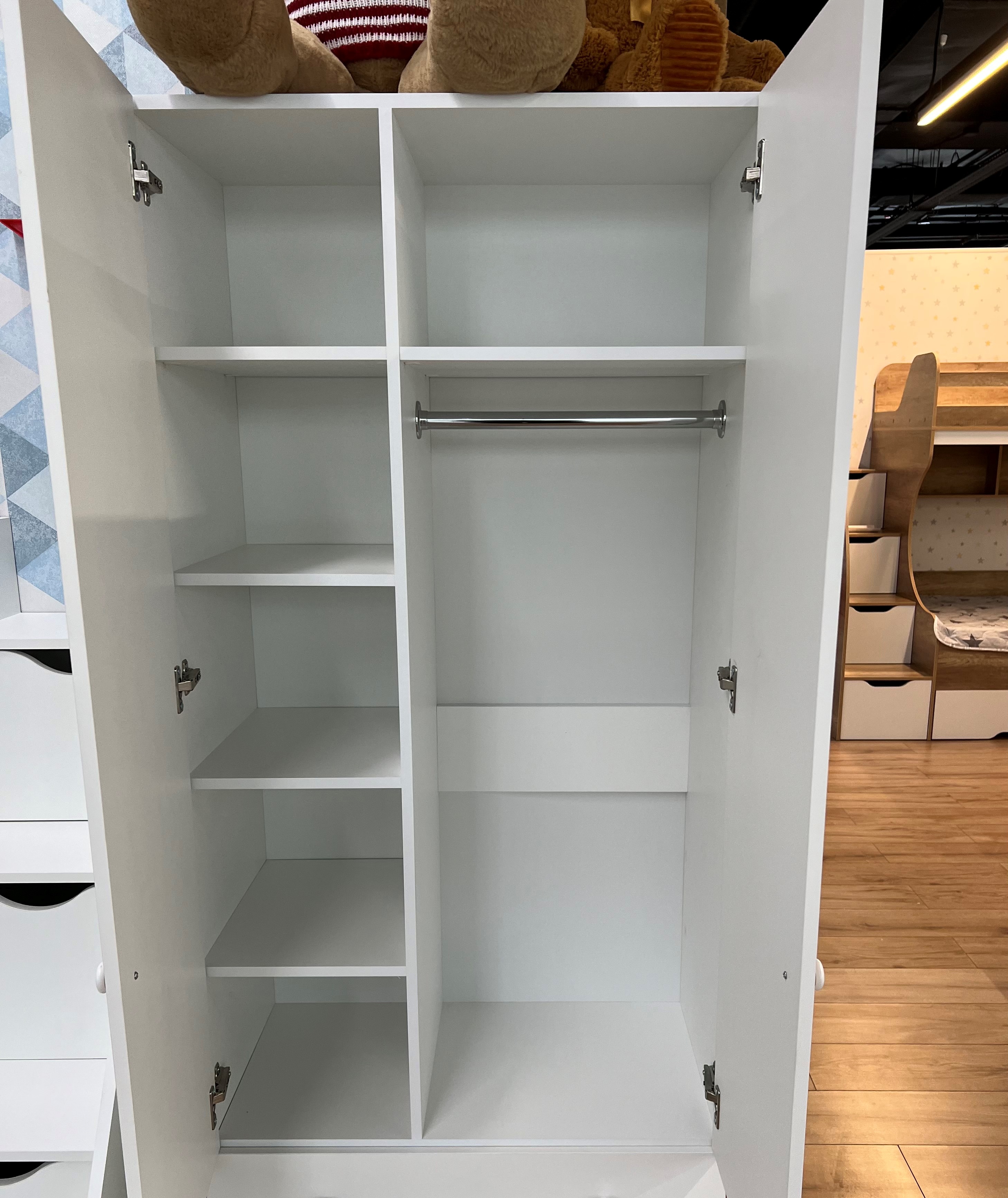 Шкаф оборудован двумя распашными дверями, двумя выдвижными ящиками для хранения мелких вещей.