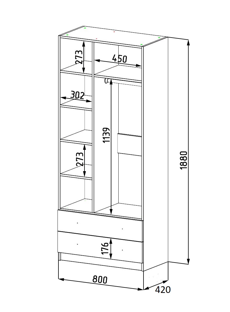 Габариты шкафа: высота 2251 х ширина 800 х глубина 420