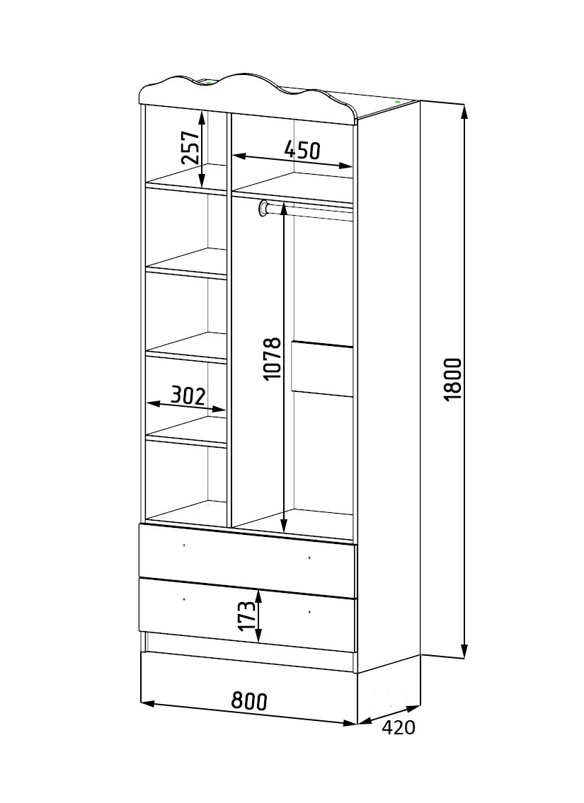 Внутри шкафа имеются штанга для вещей и дополнительные боковые полки.