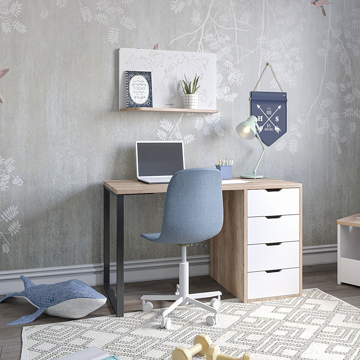 кровать Умка-5 New + стеллаж-перегородка Стиль + стол Соло + полка настенная Лофт-800