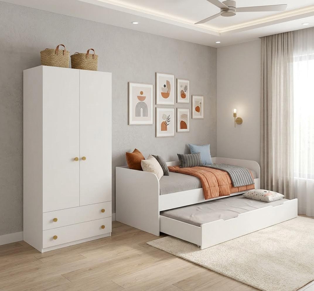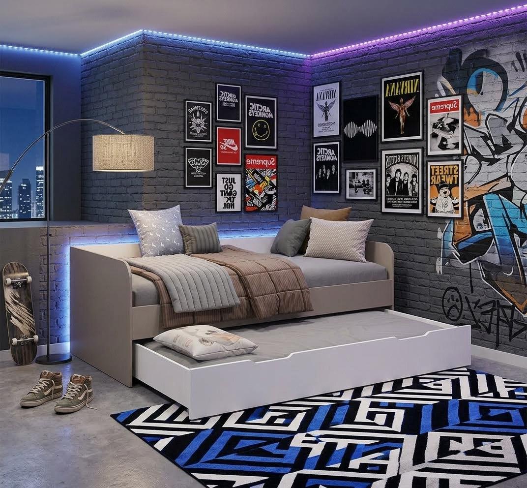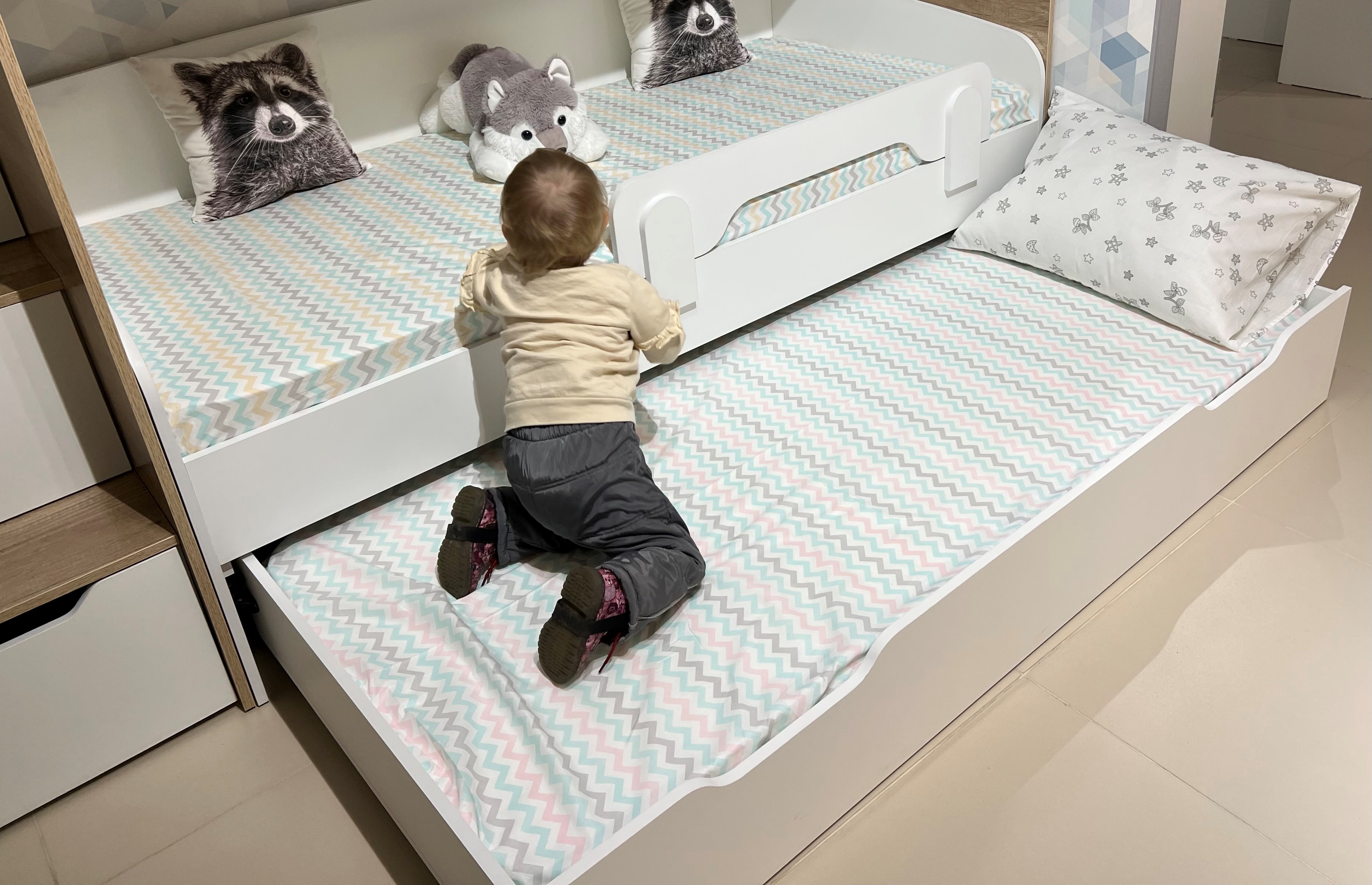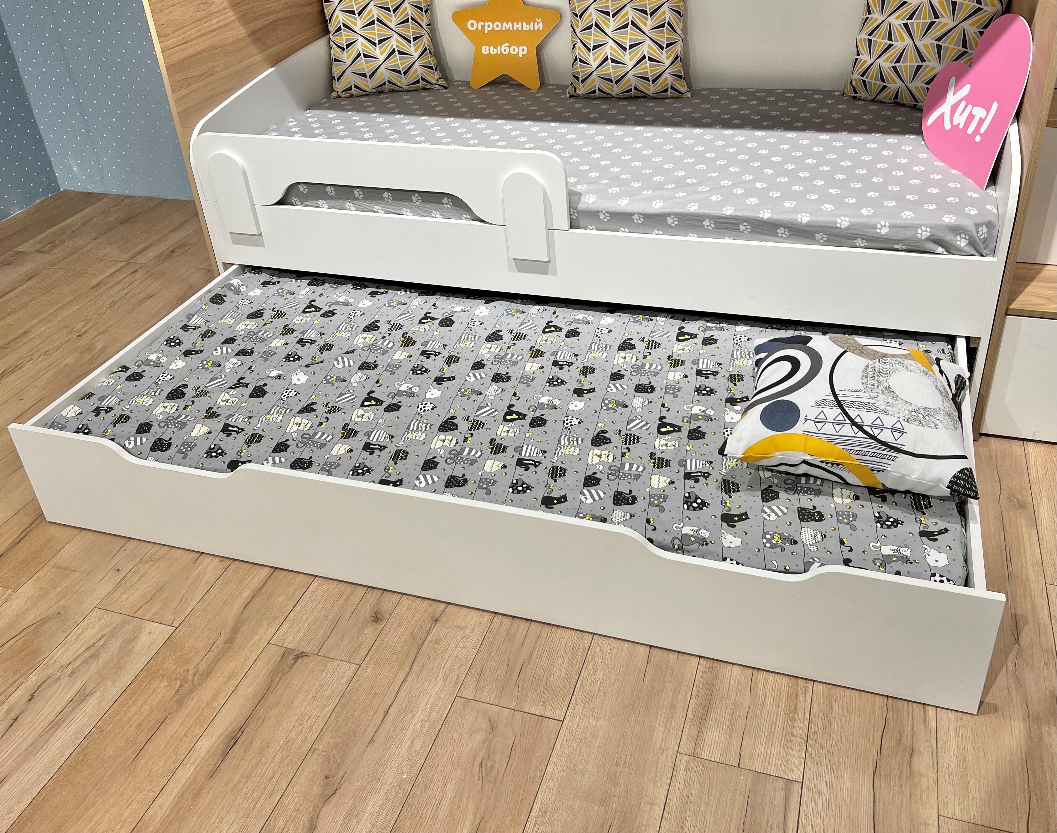 Экономия пространства:выдвижное спальное место легко убирается под основную кровать, освобождая место для игр и активного отдыха.