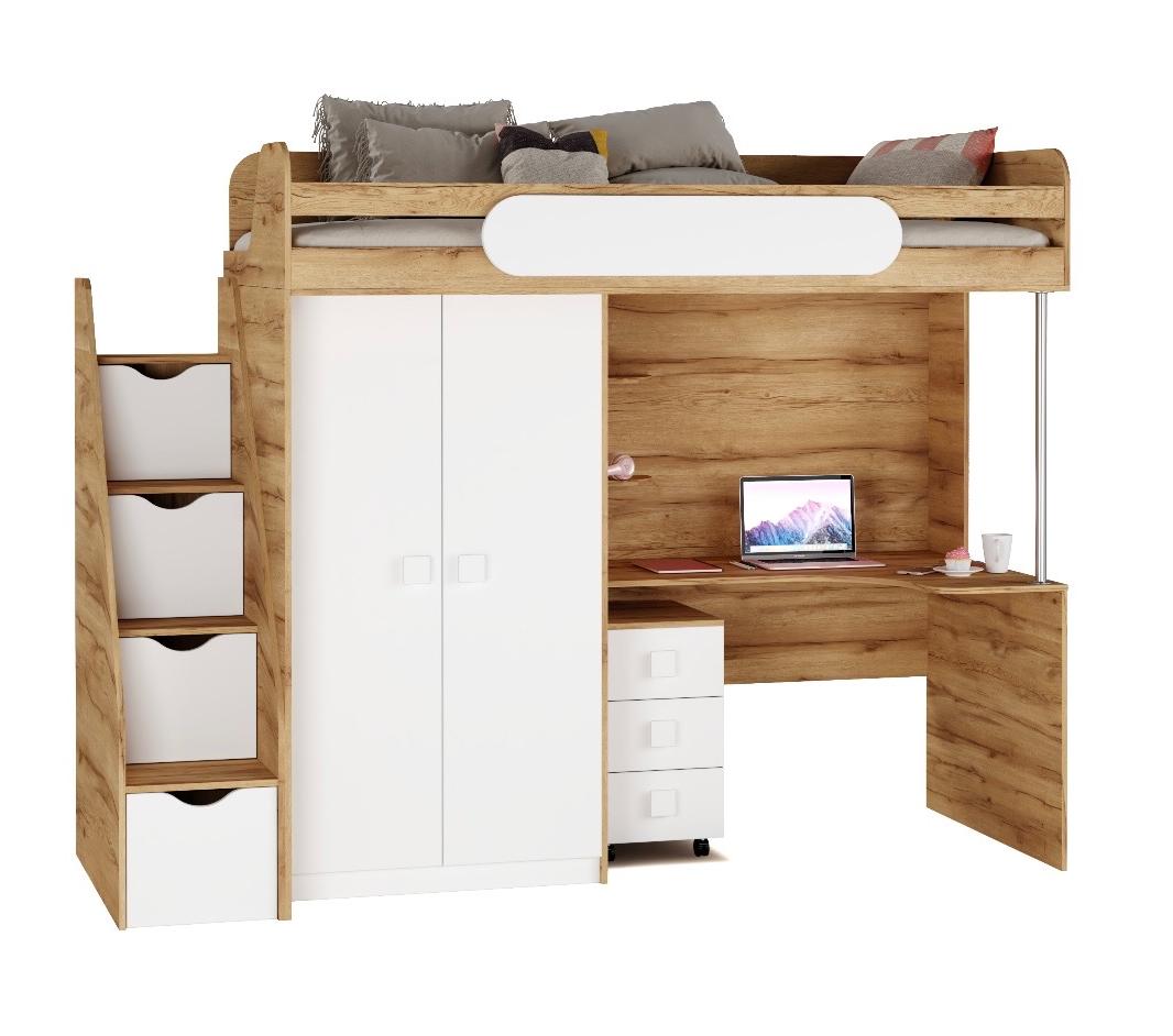 Кровать-чердак с рабочим пространством и шкафом – идеальное решение для детской комнаты.