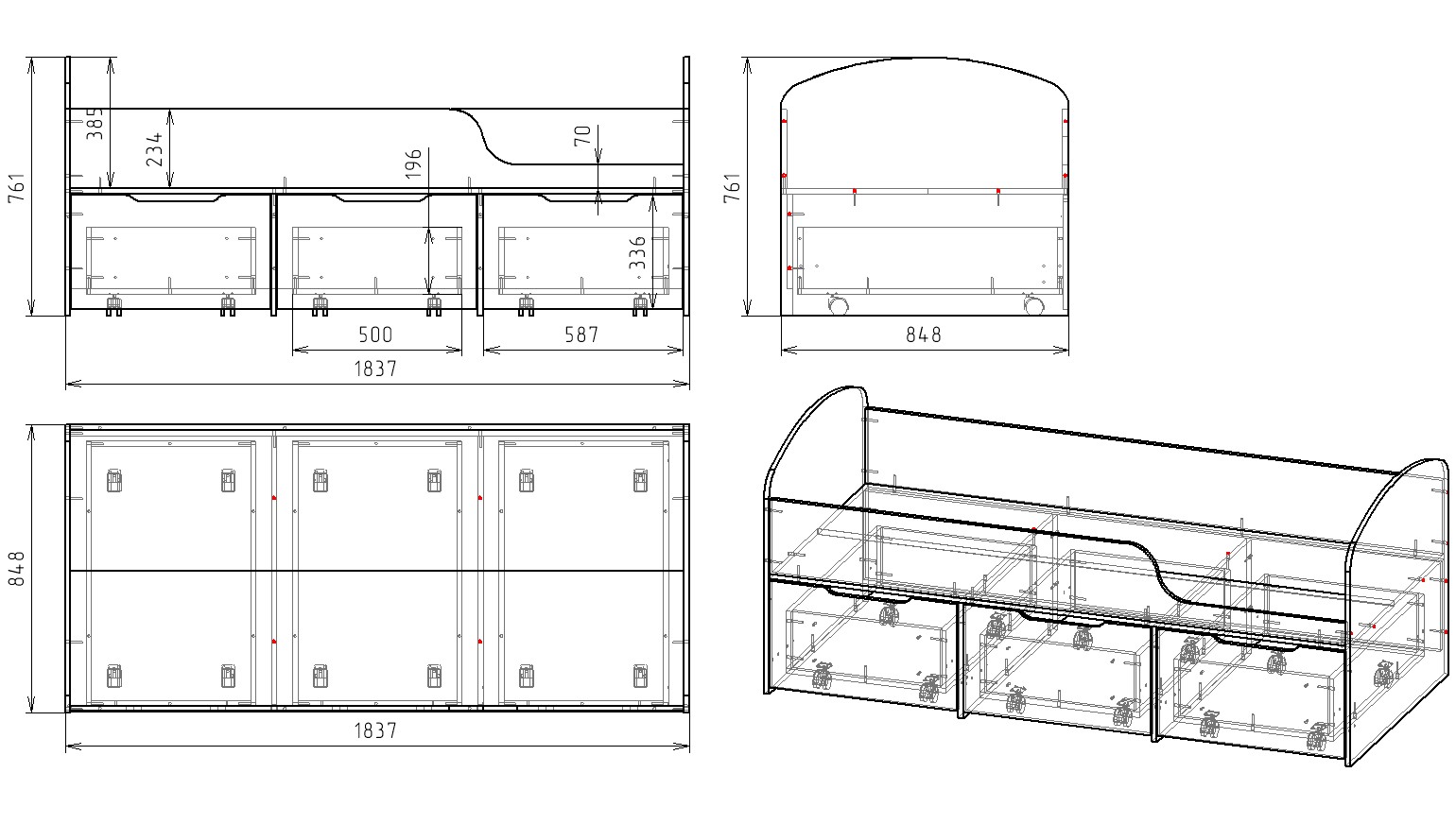 Габариты кровати: ширина 1837 х глубина 848 х высота 761 мм,