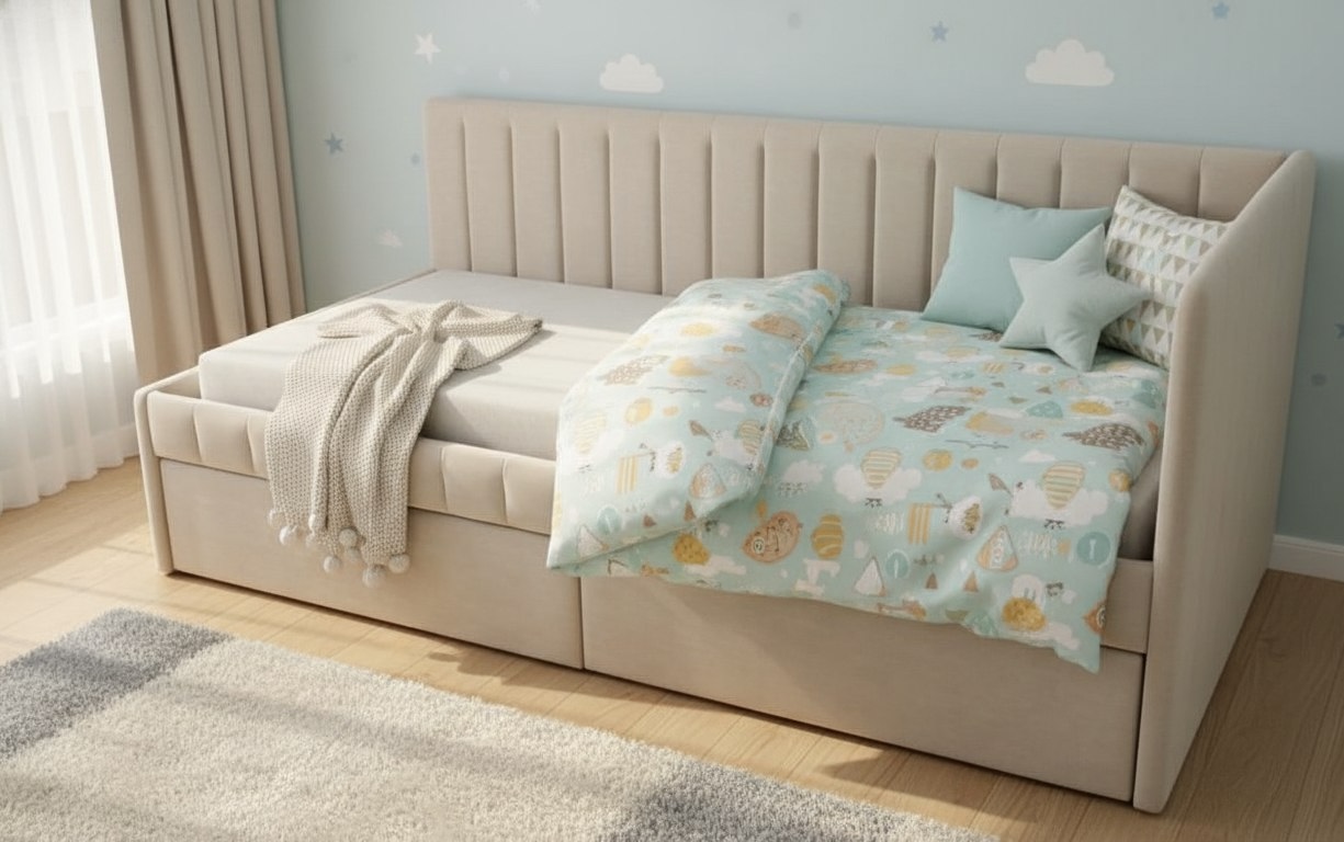 Кровать разработана с учетом требований к безопасности ребенка, сглаженные, мягкие углы, прочная конструкция и безопасные, гипоаллергенные материалы.