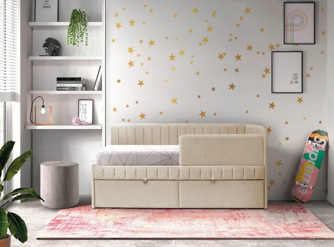 Очень уютный, компактный и стильный диванчик станет прекрасным спальным местом в комнате ребенка.