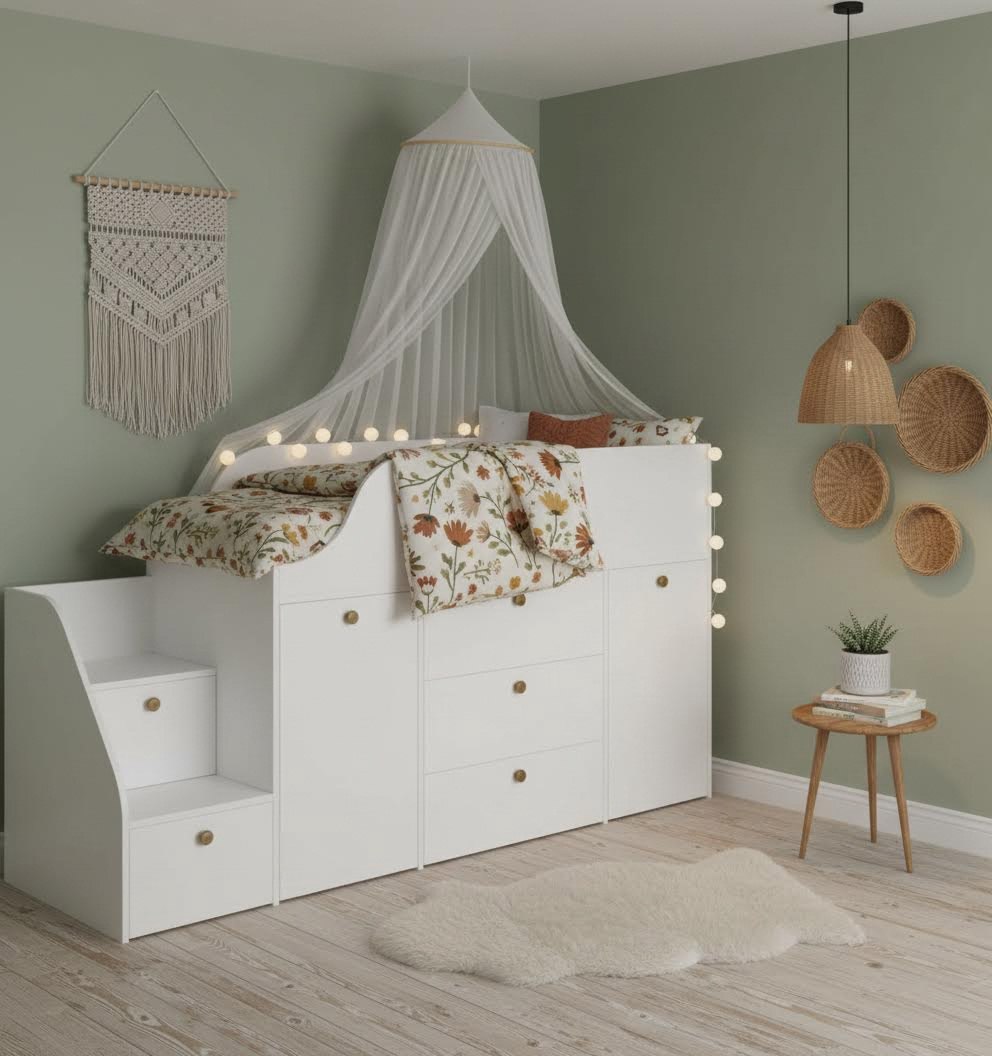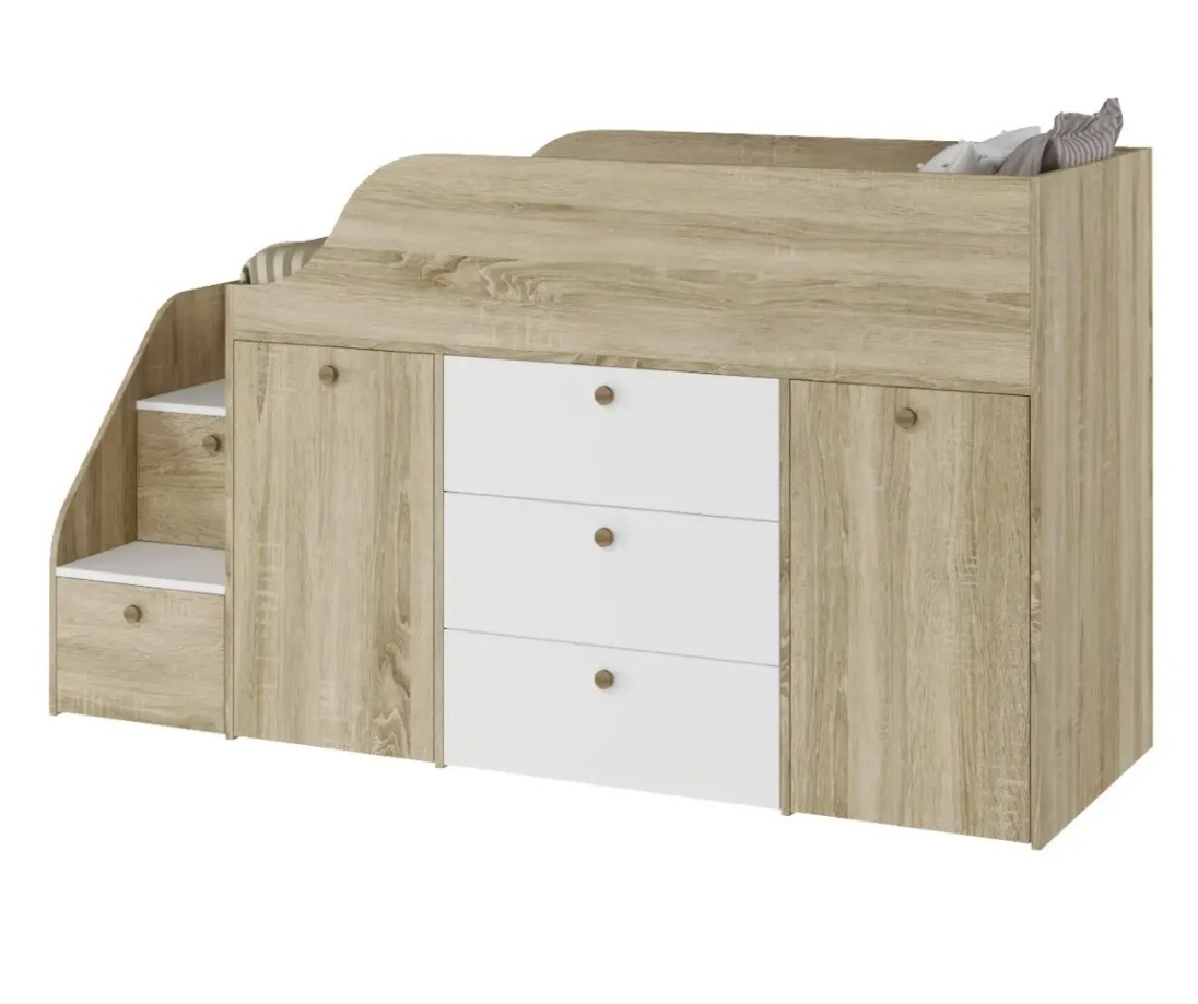 Функциональная кровать с удобной лестницей и множеством мест для хранения детских вещей.