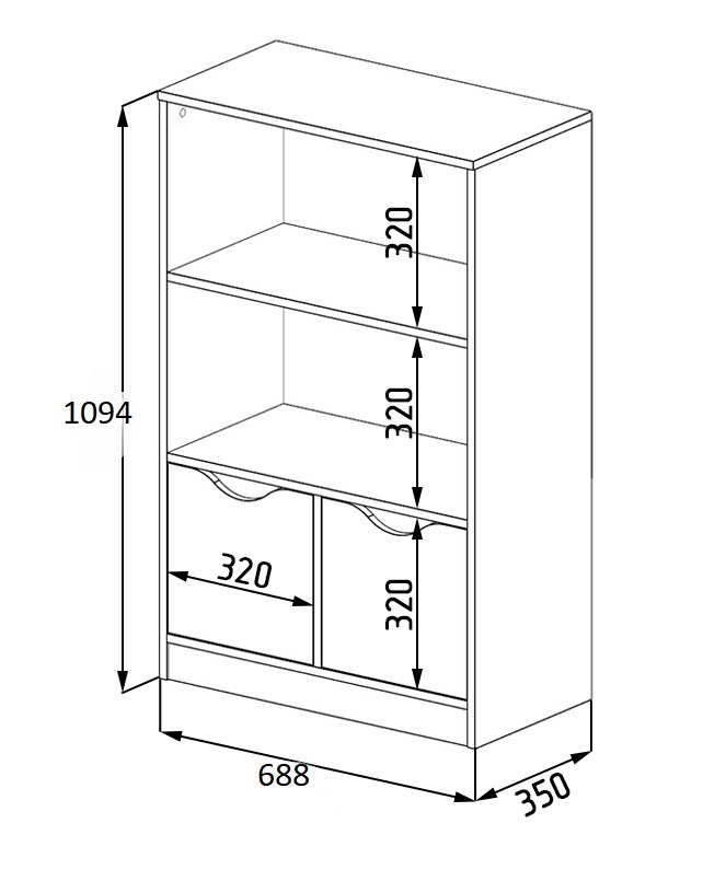 Габариты стеллажа: высота 1094, глубина 350, ширина 688 мм