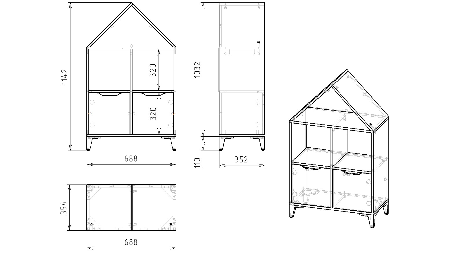 Габариты: высота 1142, глубина 354, ширина 688 мм