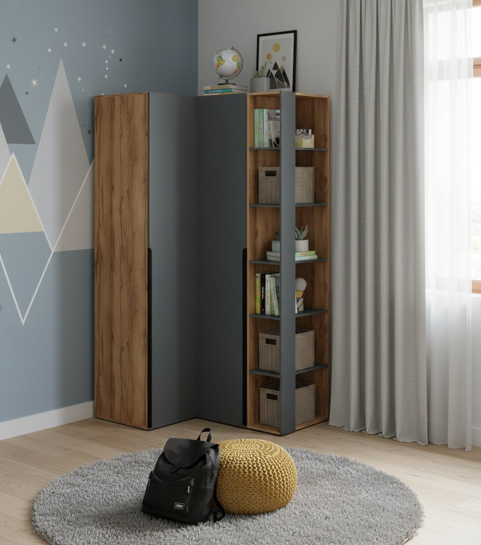 Угловой шкаф + пенал + торцевой стеллаж коллекции Брайт Графит